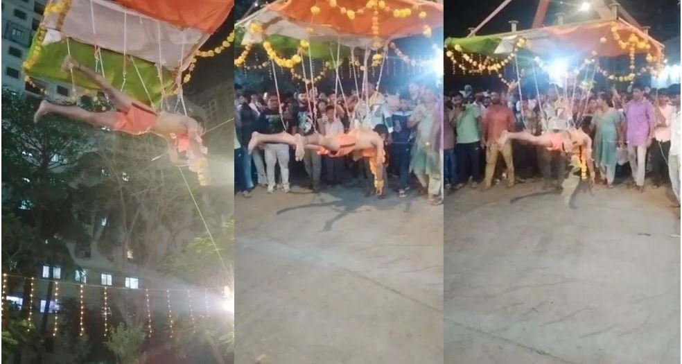 एका 23 वर्षीय तरुणाने नवस फेडण्यासाठी स्वतःच्या शरीराला हुक लावून थेट क्रेनच्या साहाय्याने सुमारे 15 फूट उंचीवर लटकत मिरवणुकीत सहभाग घेतला.